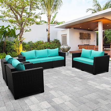 Amazon Com Outdoor Wicker Furniture Set 4 Pieces Patio Sectional Sofa Couch Set With Turquoise Cushions And Furniture Covers Black Pe Rattan Garden Outdoor