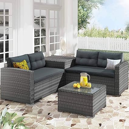 Amazon Com Nicesoul Outdoor Patio Furniture Sofa Set 4 Seatings With Large Storage Box And Coffe Table Pe Rattan Wicker Conversation Sets Grey Garden Outdoor